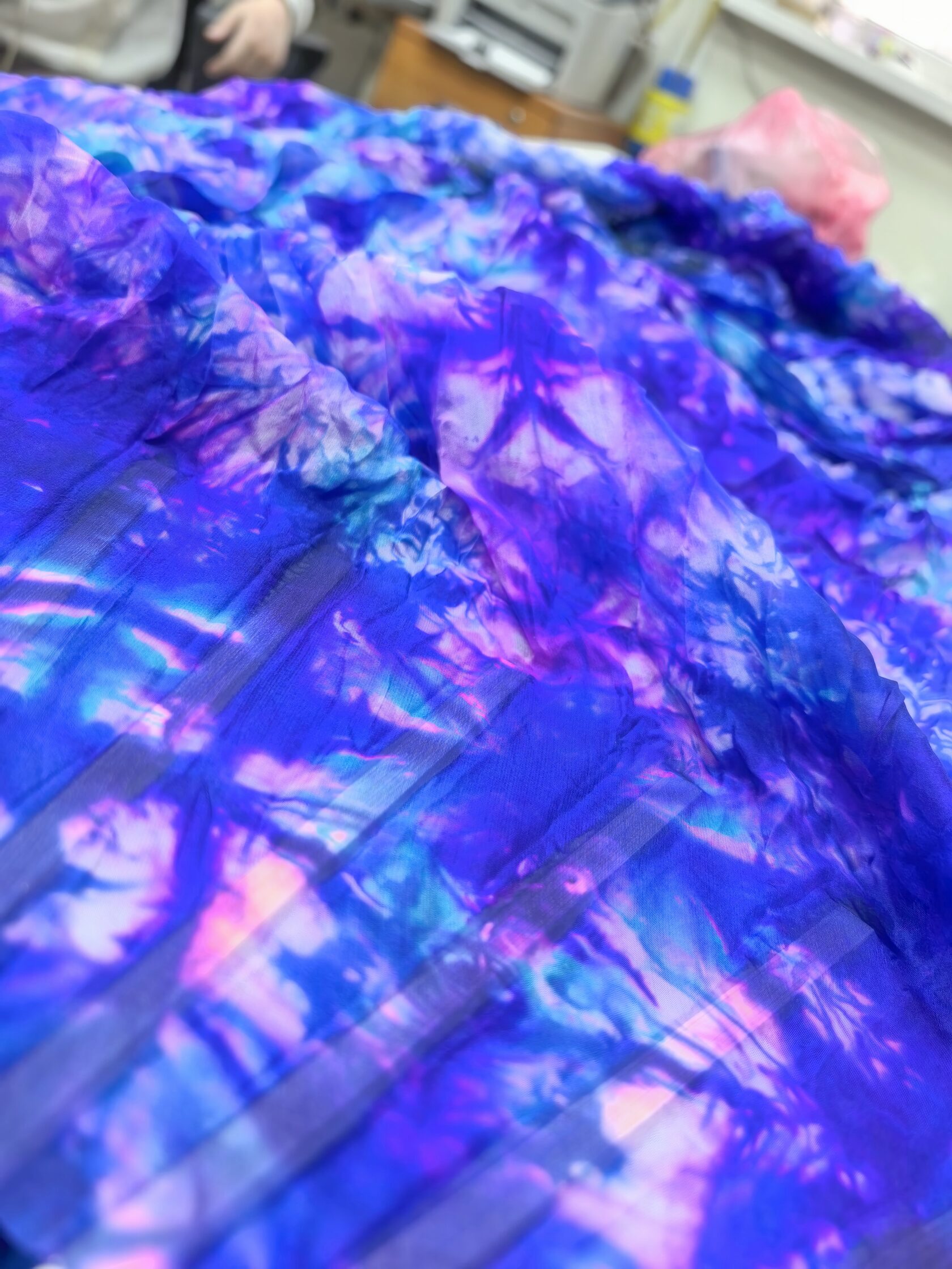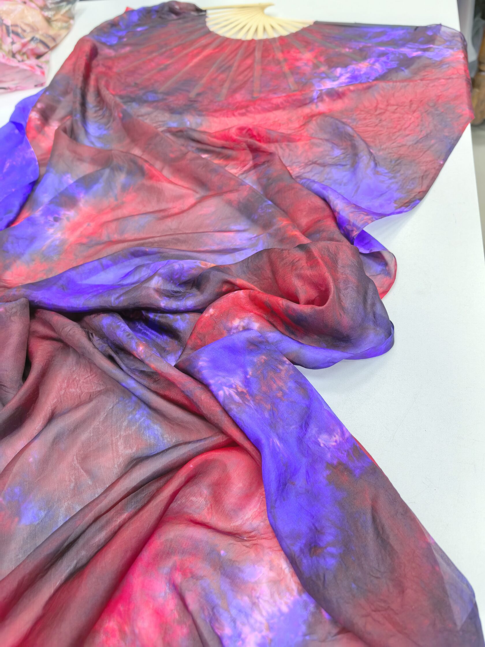 От насыщенного аметиста до нежного цвета фуксии и пыльной лаванды. Этот веер – воплощение магии, сладкой мечты и лёгкого безумия. Дымчатые переходы и яркие вкрапления создают ощущение фантасмагории, сновидения, которое можно поймать и удержать в руках. · Параметры: Эксклюзивная ручная роспись, основание – стандартные палочки 30 см, полотно 90 x 150 см.