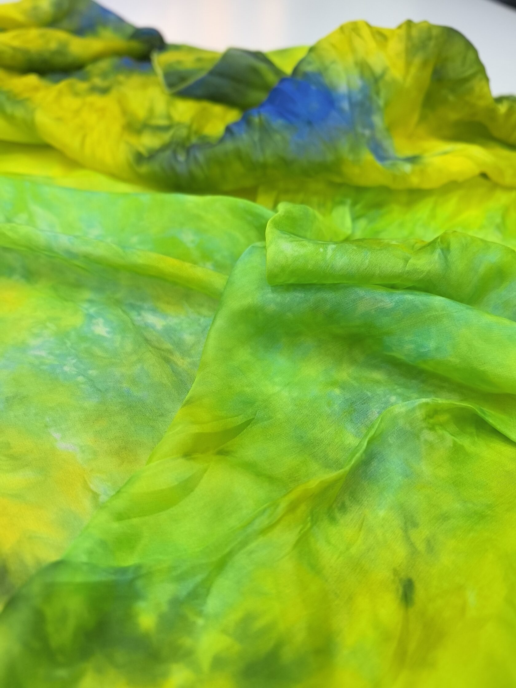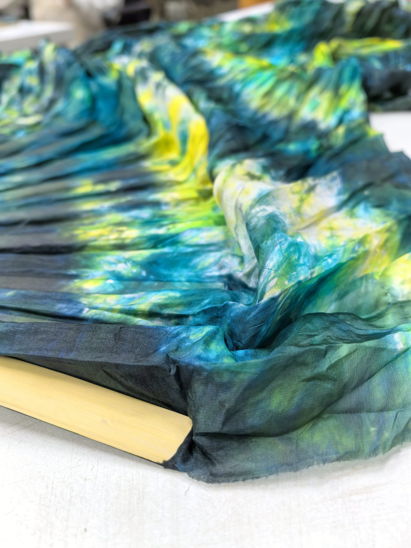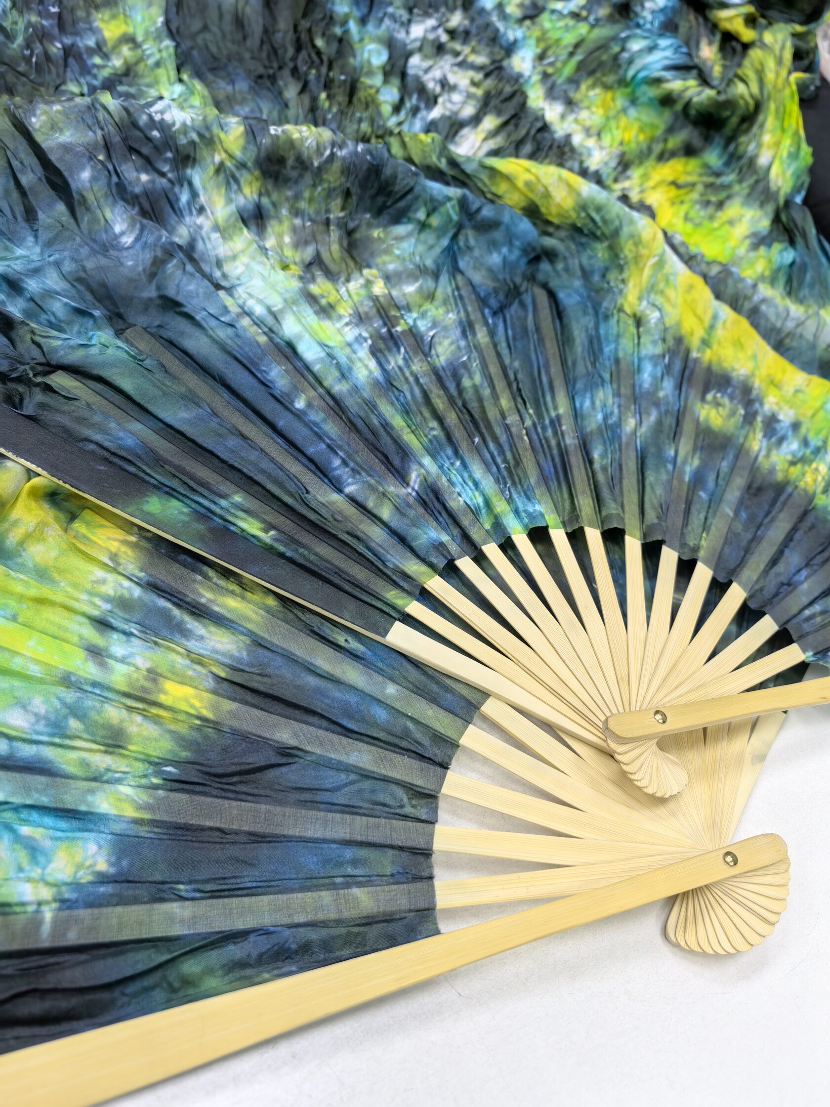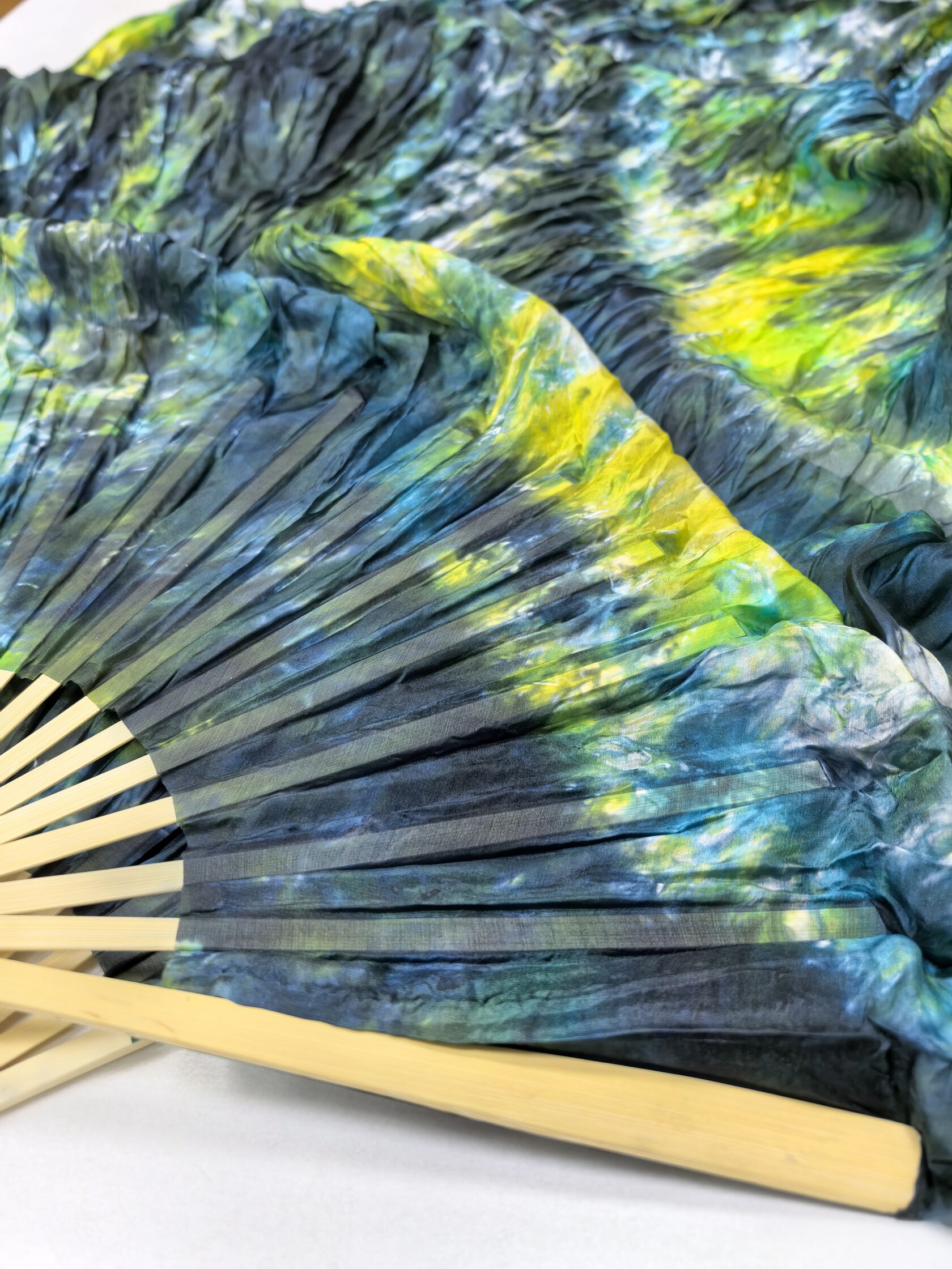 Взрыв сочности и света! Сочный лайм, спелый манго и капли чистого кобальта – этот веер будто создан из капель самого лета. Энергичные, неожиданные переходы и контрастные вкрапления дарят не просто прохладу, а заряд безудержного оптимизма. Никаких правил, только чистая радость! · Параметры: Эксклюзивная ручная роспись, основание – стандартные палочки 30 см, полотно 90 x 150 см.
