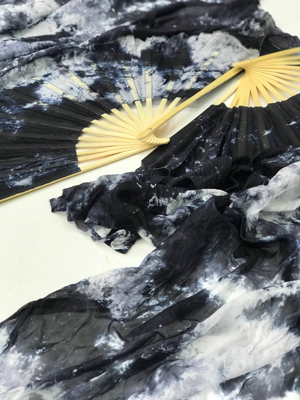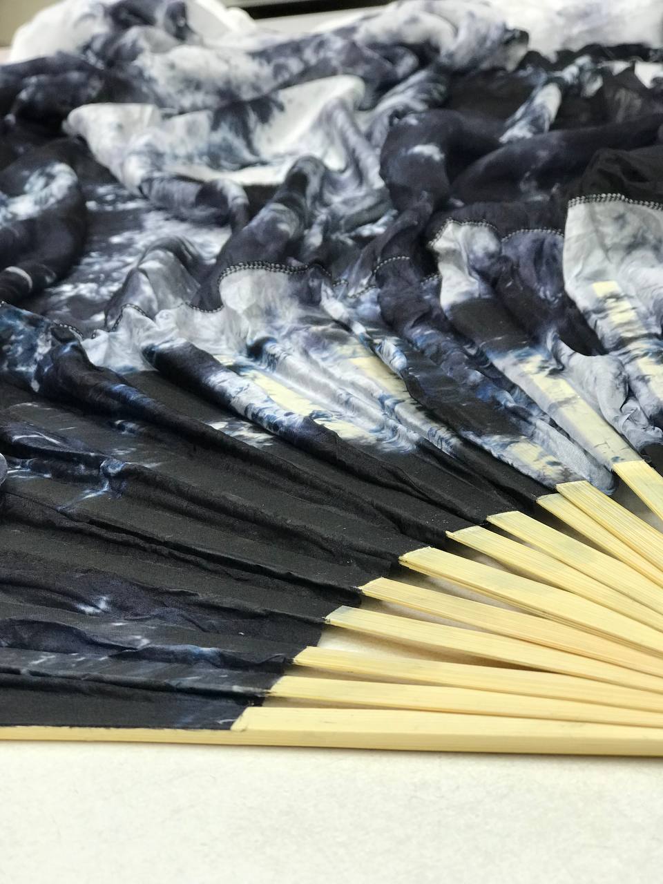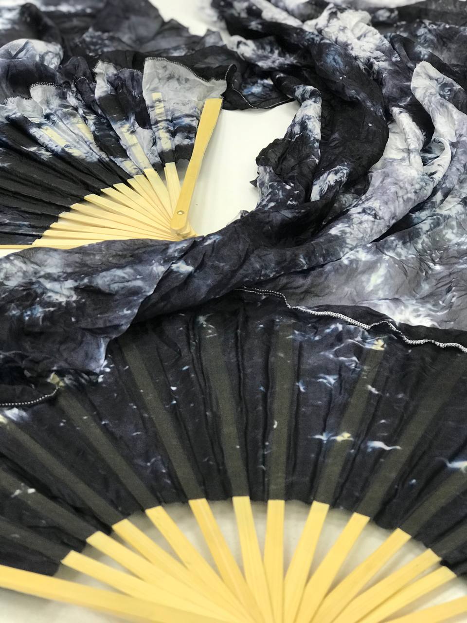 Изысканный минимализм и тайна. Все оттенки дыма и грозового неба: от пепельного к графитовому, с призрачными переходами и вкраплениями жемчужного. Этот веер – для истинных ценителей, кто видит красоту в полутонах, намёках и интеллектуальной элегантности. · Параметры: Эксклюзивная ручная роспись, основание – стандартные палочки 30 см, полотно 90 x 150 см.