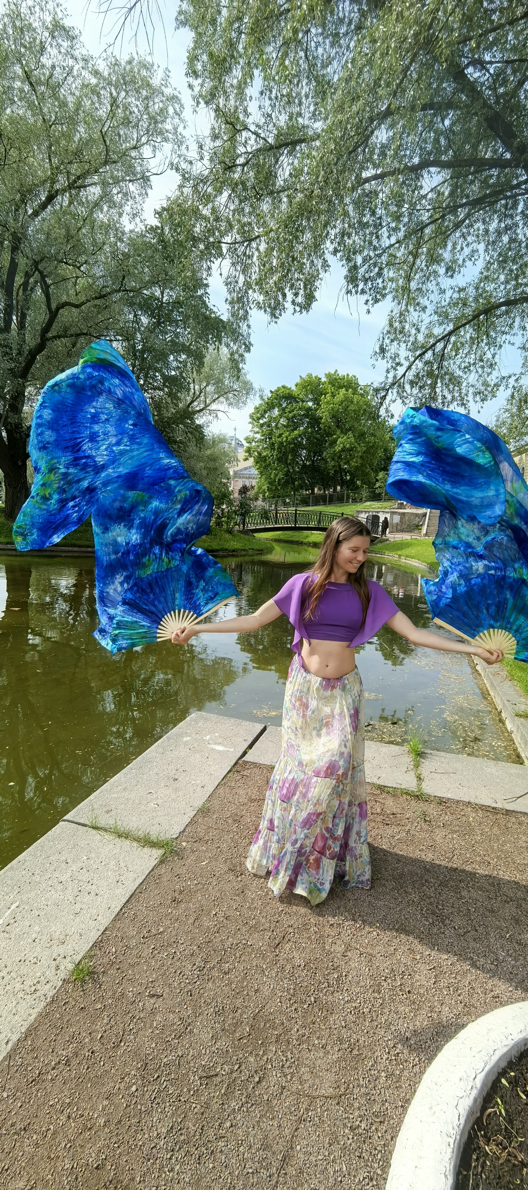 Шелковый веер-вейл в морских тонах: купить и вплети в свой танец частичку океана. Наши вееры-вейлы из натурального шелка — это танцевальные аксессуар, преображающие ваши движения в потрясающее танцевальное представление. Ощутите гладкость шелка и легкость движения, придающие элегантности каждому вашему шагу.м Цена указана за пару (длина 150 см)